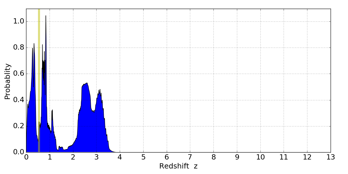 In P(z) plots: Yellow lines mark the cluster redshift z = 0.546,