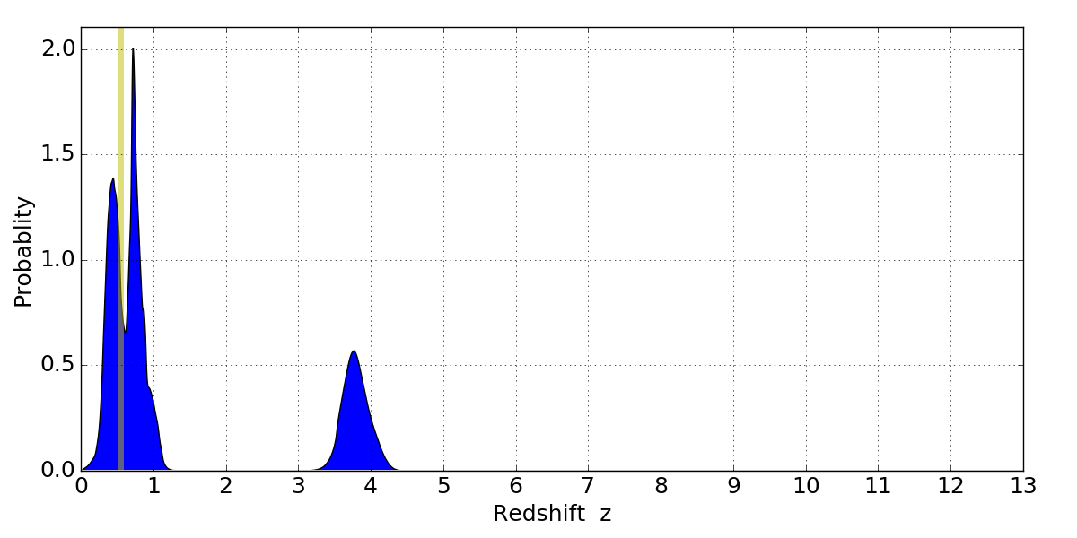 In P(z) plots: Yellow lines mark the cluster redshift z = 0.546,