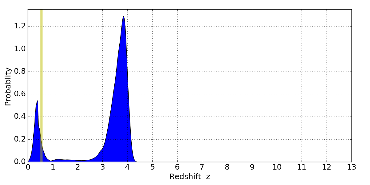 In P(z) plots: Yellow lines mark the cluster redshift z = 0.546,