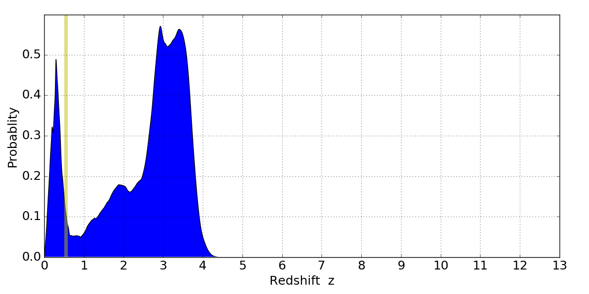 In P(z) plots: Yellow lines mark the cluster redshift z = 0.546,