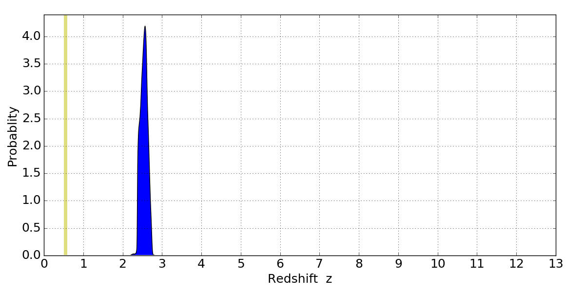 In P(z) plots: Yellow lines mark the cluster redshift z = 0.546,
