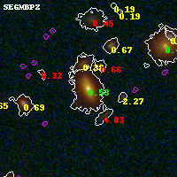 Black segments are analyzed here. Roll mouse over color images to view segments. Best viewed in a wide browser window (1200 pixels or more). Download SED & P(z) plots to view larger versions.