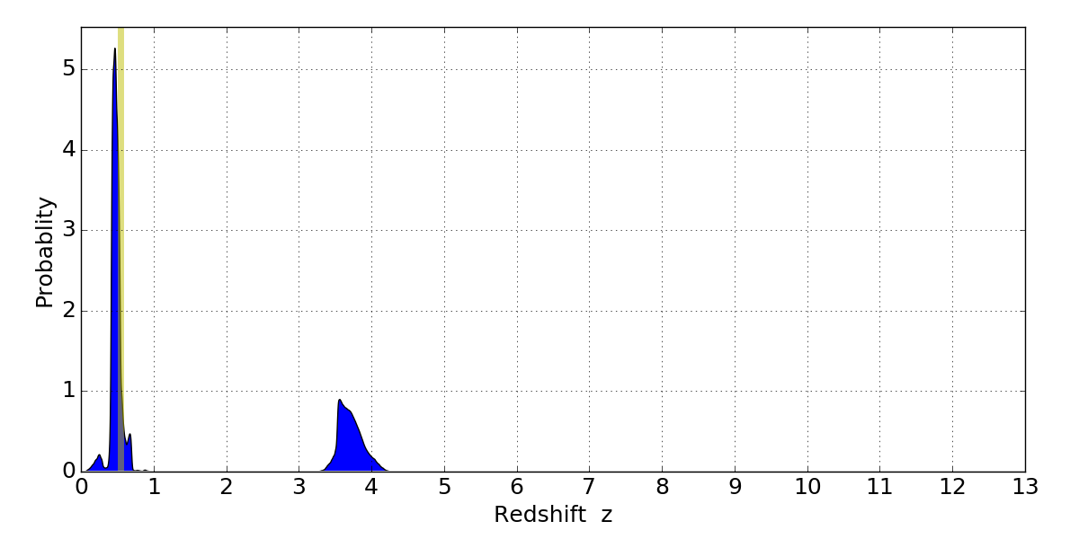 In P(z) plots: Yellow lines mark the cluster redshift z = 0.546,