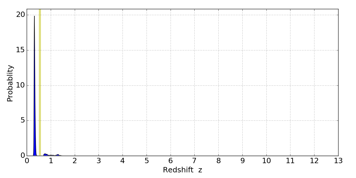 In P(z) plots: Yellow lines mark the cluster redshift z = 0.546,