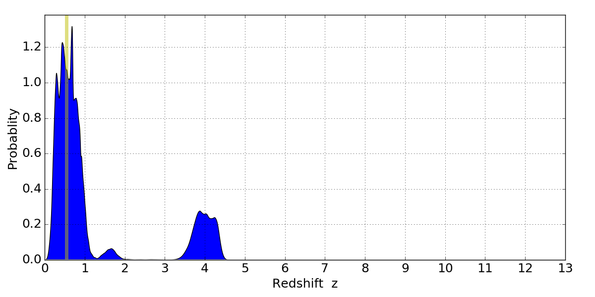 In P(z) plots: Yellow lines mark the cluster redshift z = 0.546,