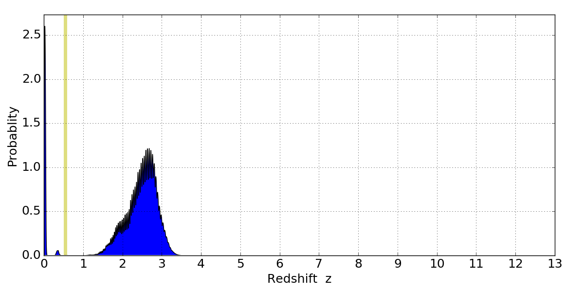 In P(z) plots: Yellow lines mark the cluster redshift z = 0.546,