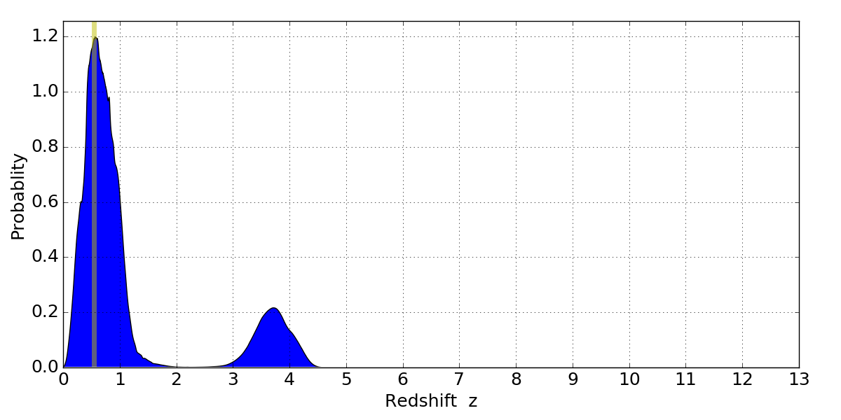 In P(z) plots: Yellow lines mark the cluster redshift z = 0.546,