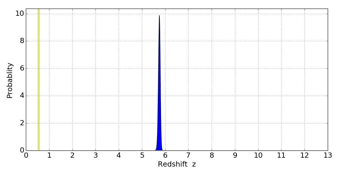 In P(z) plots: Yellow lines mark the cluster redshift z = 0.546,