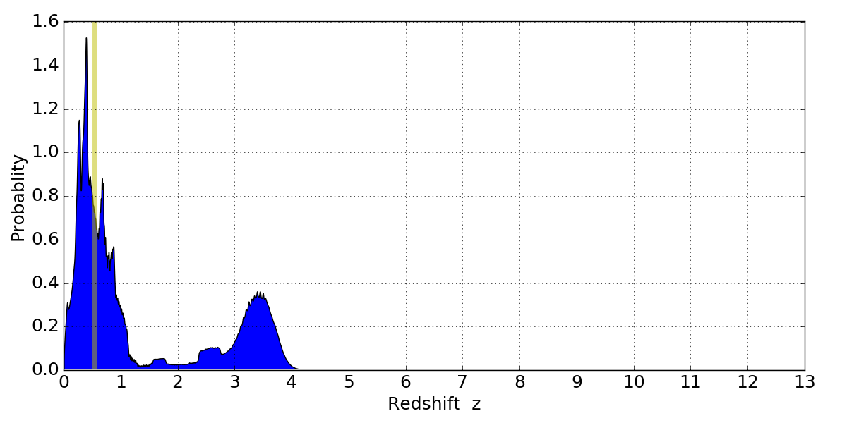 In P(z) plots: Yellow lines mark the cluster redshift z = 0.546,