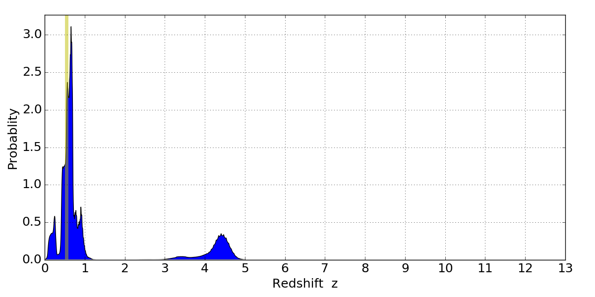 In P(z) plots: Yellow lines mark the cluster redshift z = 0.546,