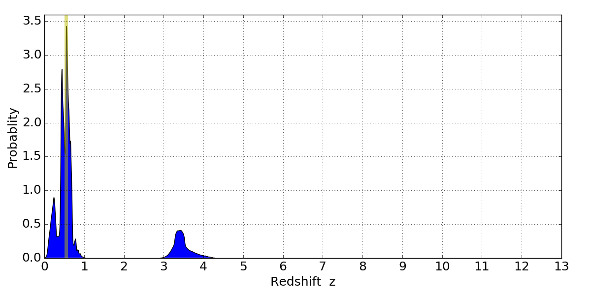 In P(z) plots: Yellow lines mark the cluster redshift z = 0.546,
