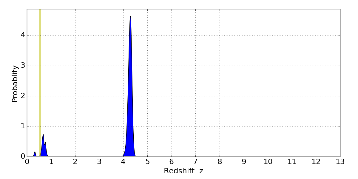 In P(z) plots: Yellow lines mark the cluster redshift z = 0.546,