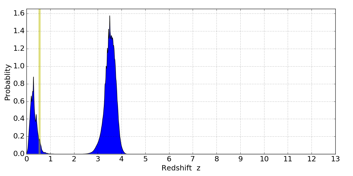 In P(z) plots: Yellow lines mark the cluster redshift z = 0.546,