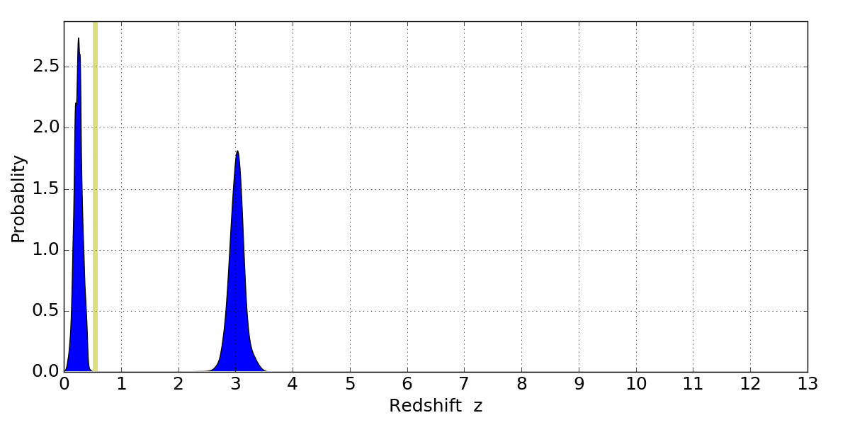 In P(z) plots: Yellow lines mark the cluster redshift z = 0.546,