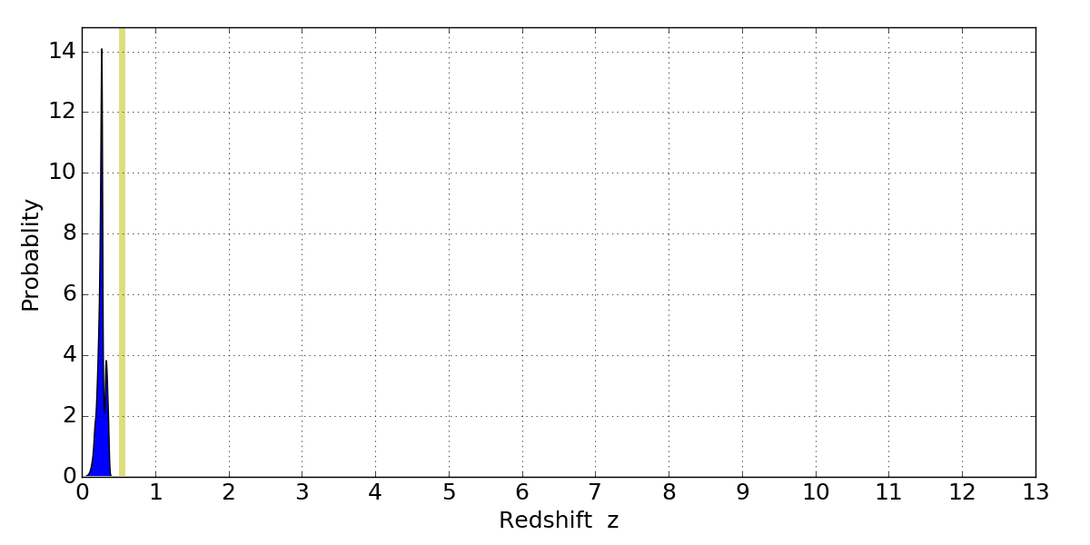 In P(z) plots: Yellow lines mark the cluster redshift z = 0.546,