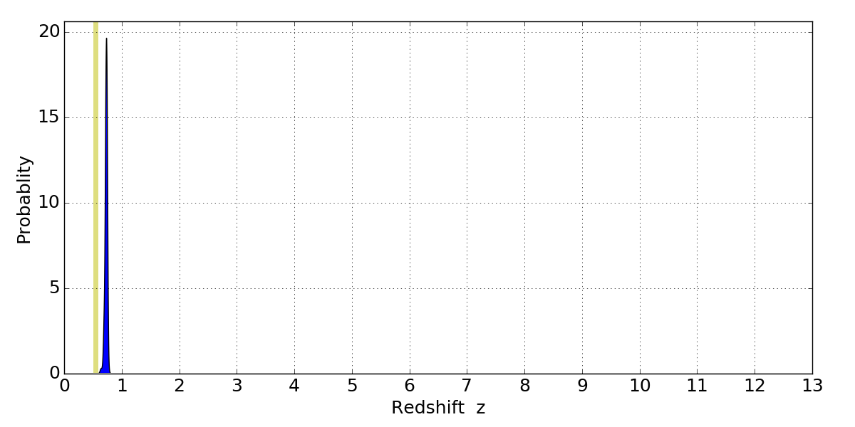 In P(z) plots: Yellow lines mark the cluster redshift z = 0.546,