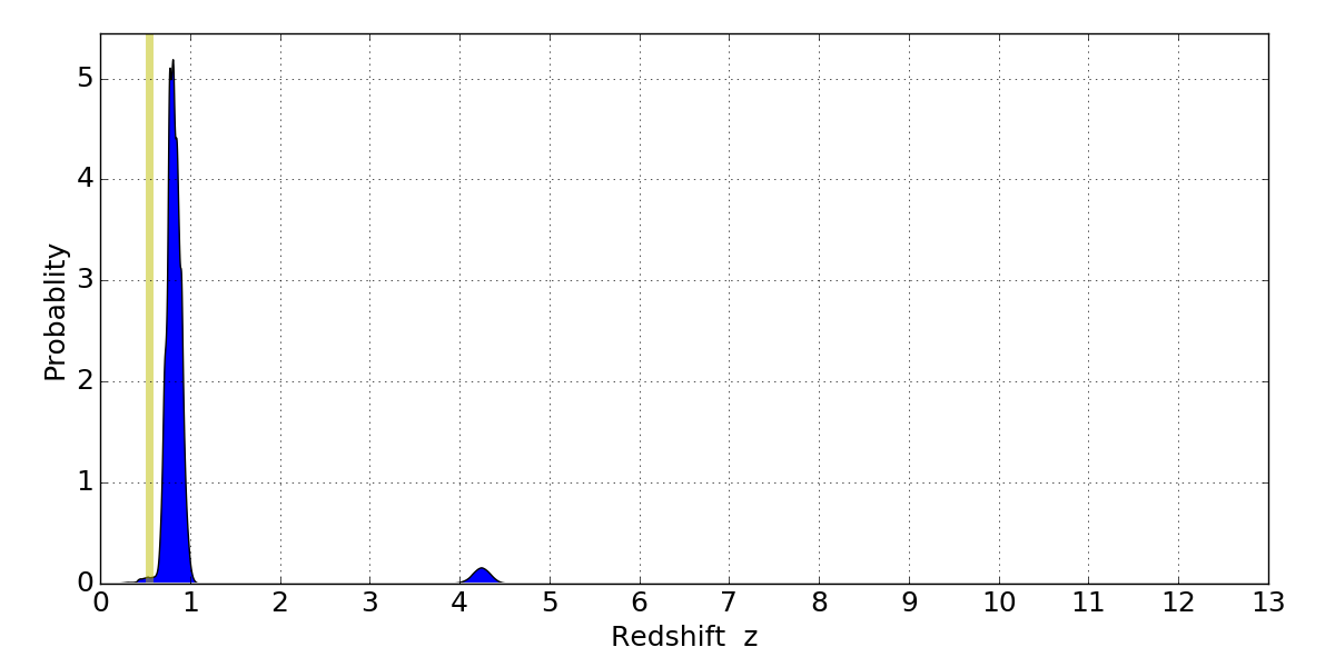 In P(z) plots: Yellow lines mark the cluster redshift z = 0.546,