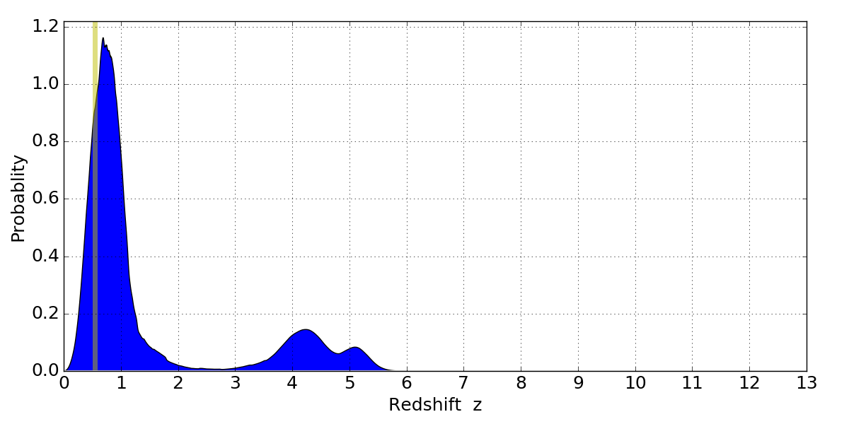 In P(z) plots: Yellow lines mark the cluster redshift z = 0.546,