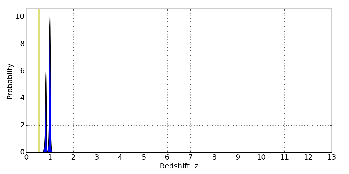 In P(z) plots: Yellow lines mark the cluster redshift z = 0.546,