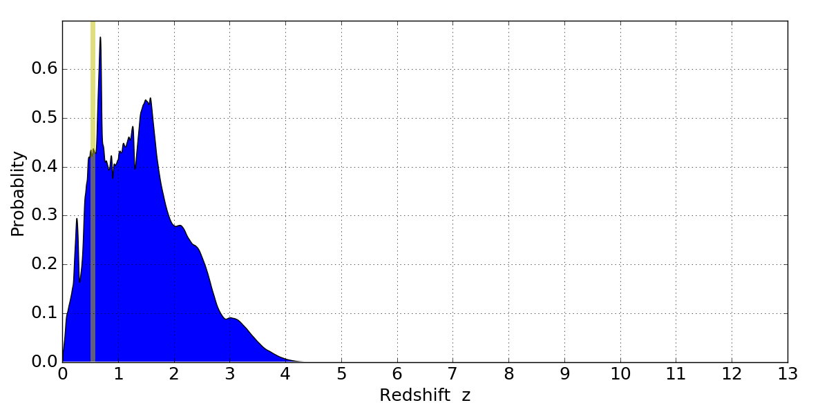 In P(z) plots: Yellow lines mark the cluster redshift z = 0.546,