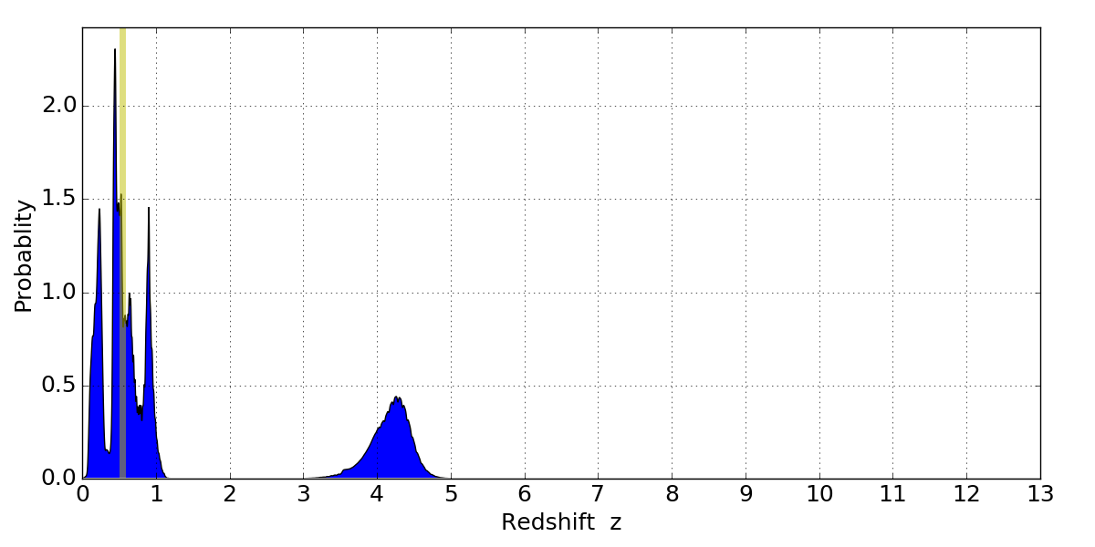 In P(z) plots: Yellow lines mark the cluster redshift z = 0.546,