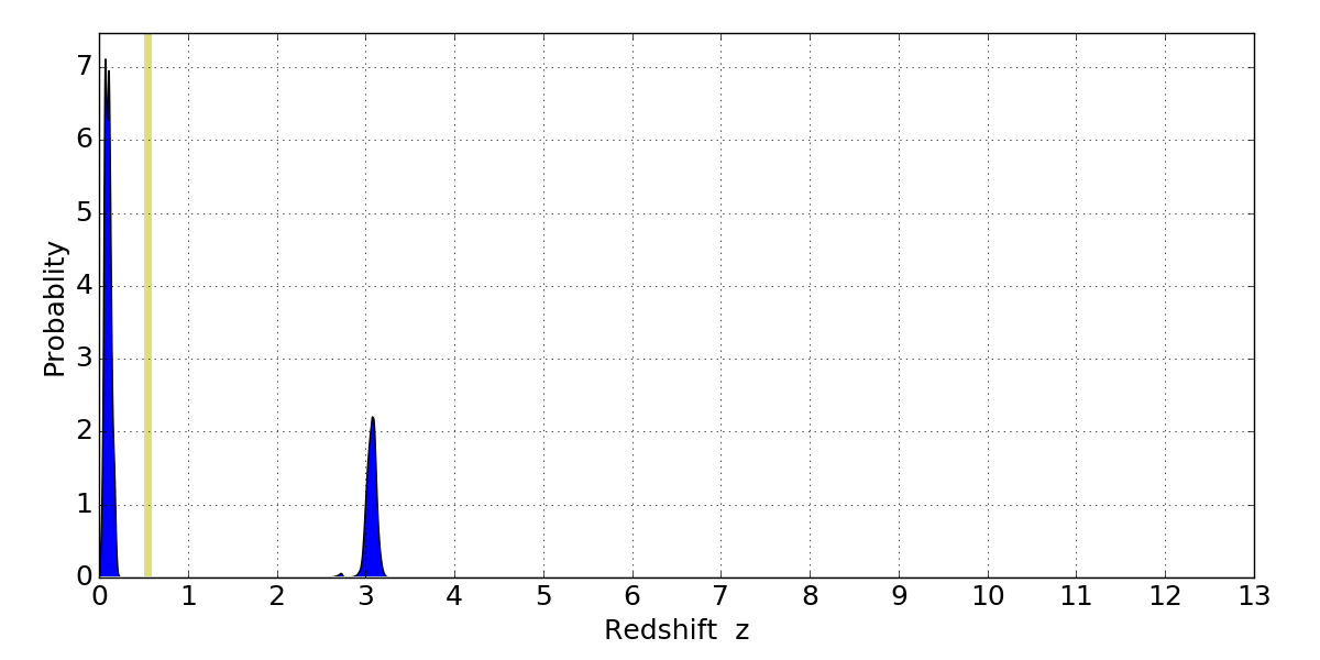 In P(z) plots: Yellow lines mark the cluster redshift z = 0.546,