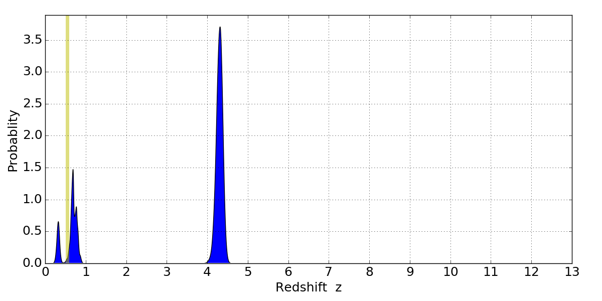 In P(z) plots: Yellow lines mark the cluster redshift z = 0.546,