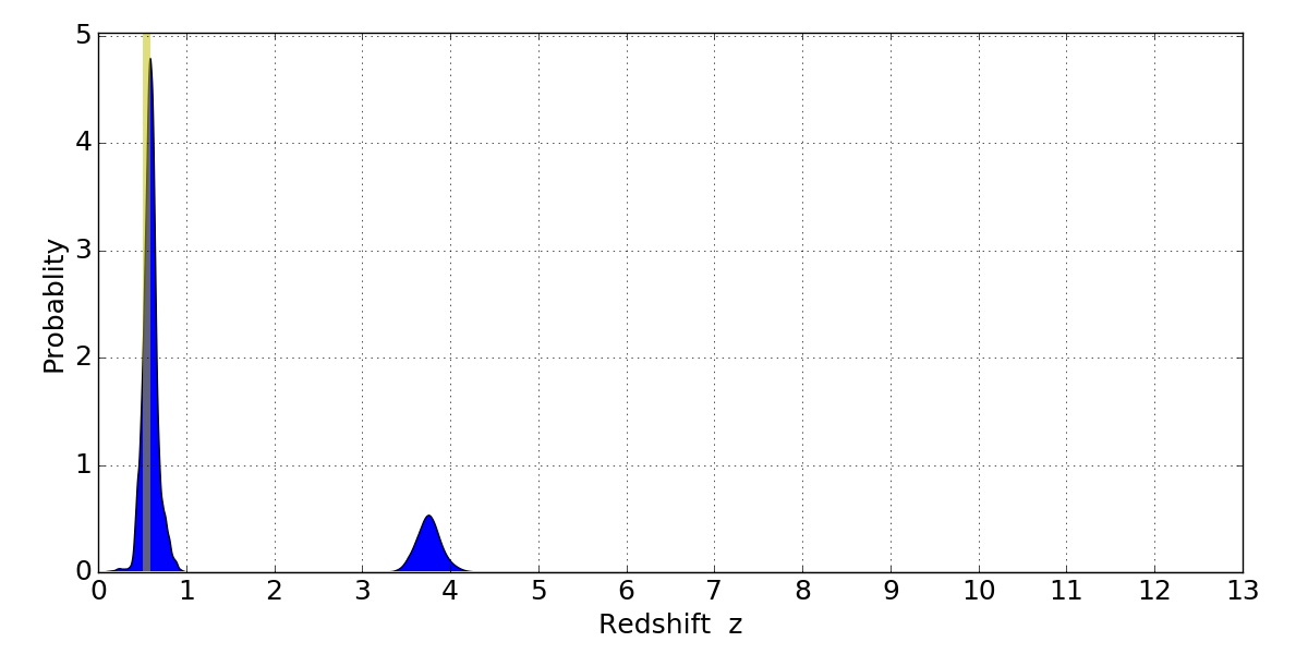 In P(z) plots: Yellow lines mark the cluster redshift z = 0.546,