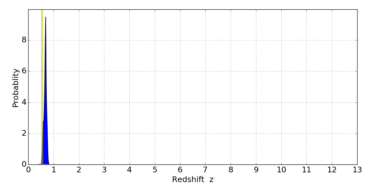 In P(z) plots: Yellow lines mark the cluster redshift z = 0.546,