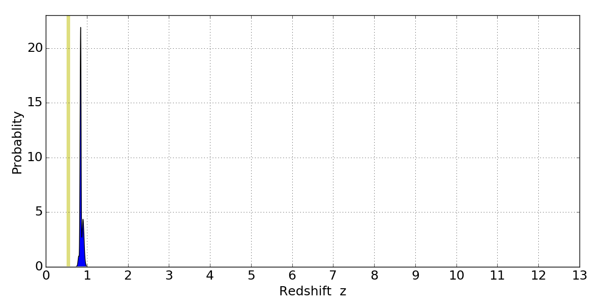 In P(z) plots: Yellow lines mark the cluster redshift z = 0.546,