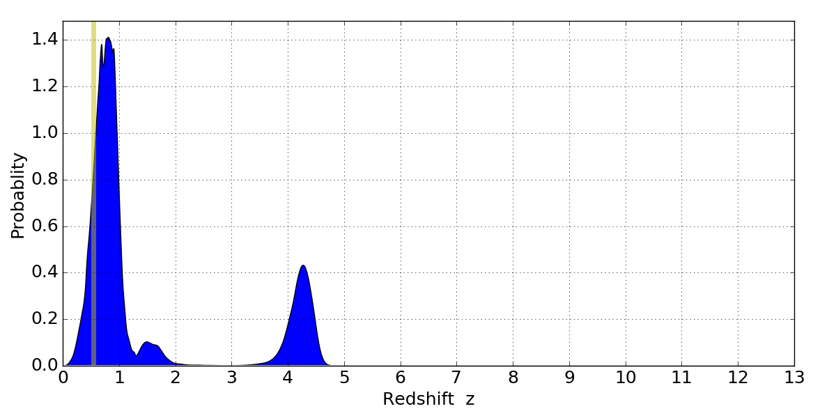 In P(z) plots: Yellow lines mark the cluster redshift z = 0.546,