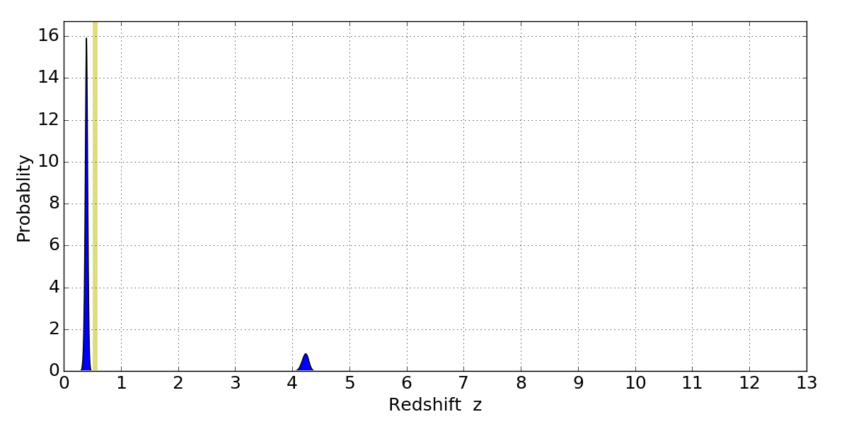 In P(z) plots: Yellow lines mark the cluster redshift z = 0.546,