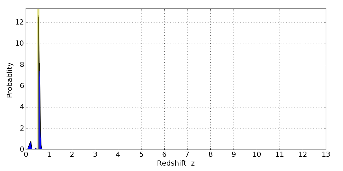In P(z) plots: Yellow lines mark the cluster redshift z = 0.546,