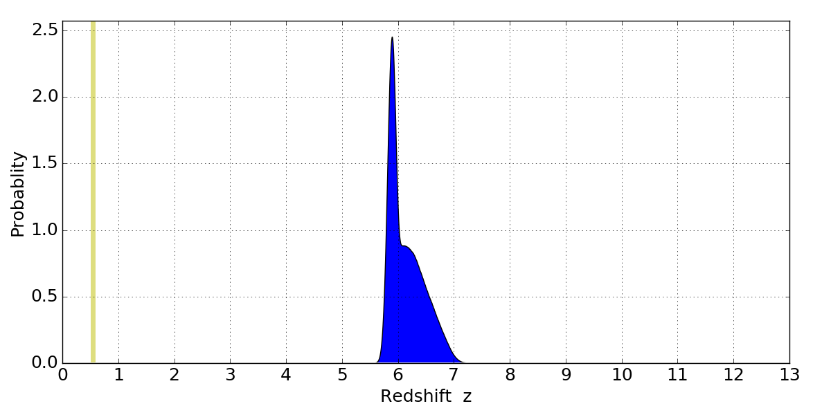 In P(z) plots: Yellow lines mark the cluster redshift z = 0.546,