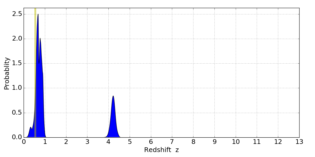 In P(z) plots: Yellow lines mark the cluster redshift z = 0.546,