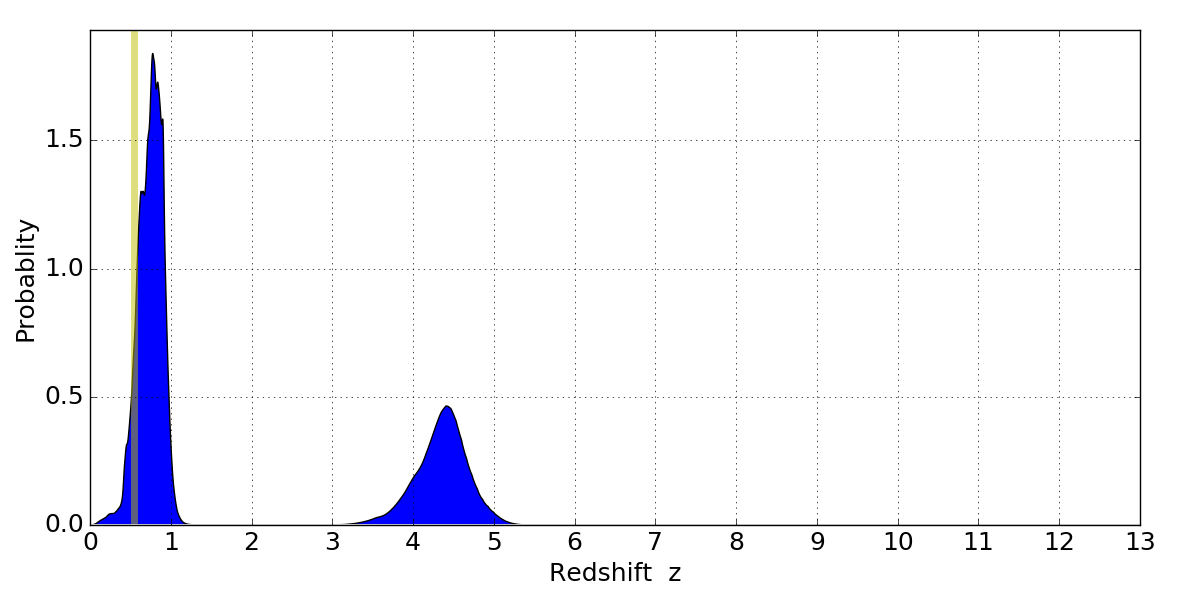 In P(z) plots: Yellow lines mark the cluster redshift z = 0.546,