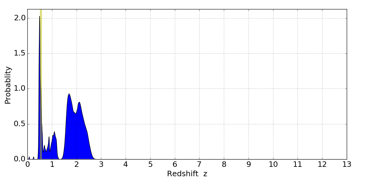 In P(z) plots: Yellow lines mark the cluster redshift z = 0.546,