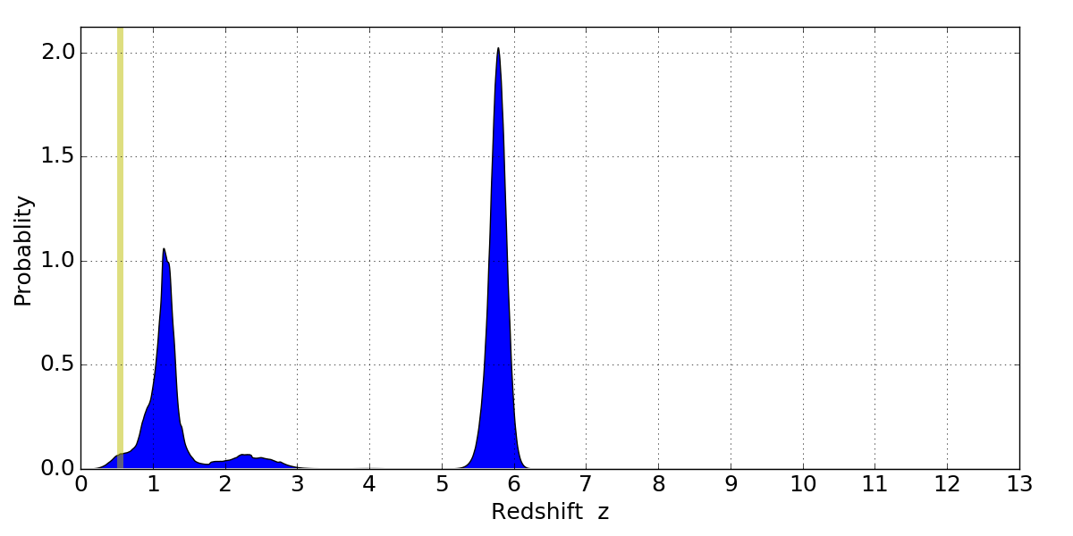 In P(z) plots: Yellow lines mark the cluster redshift z = 0.546,