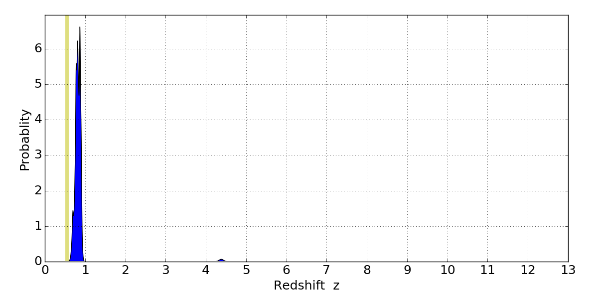 In P(z) plots: Yellow lines mark the cluster redshift z = 0.546,