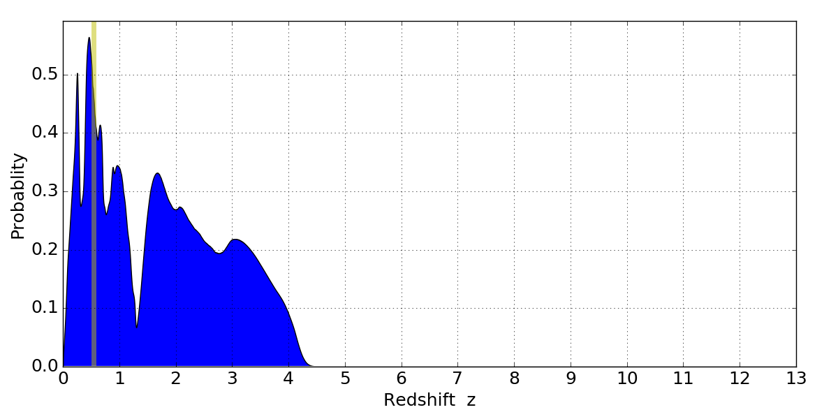 In P(z) plots: Yellow lines mark the cluster redshift z = 0.546,