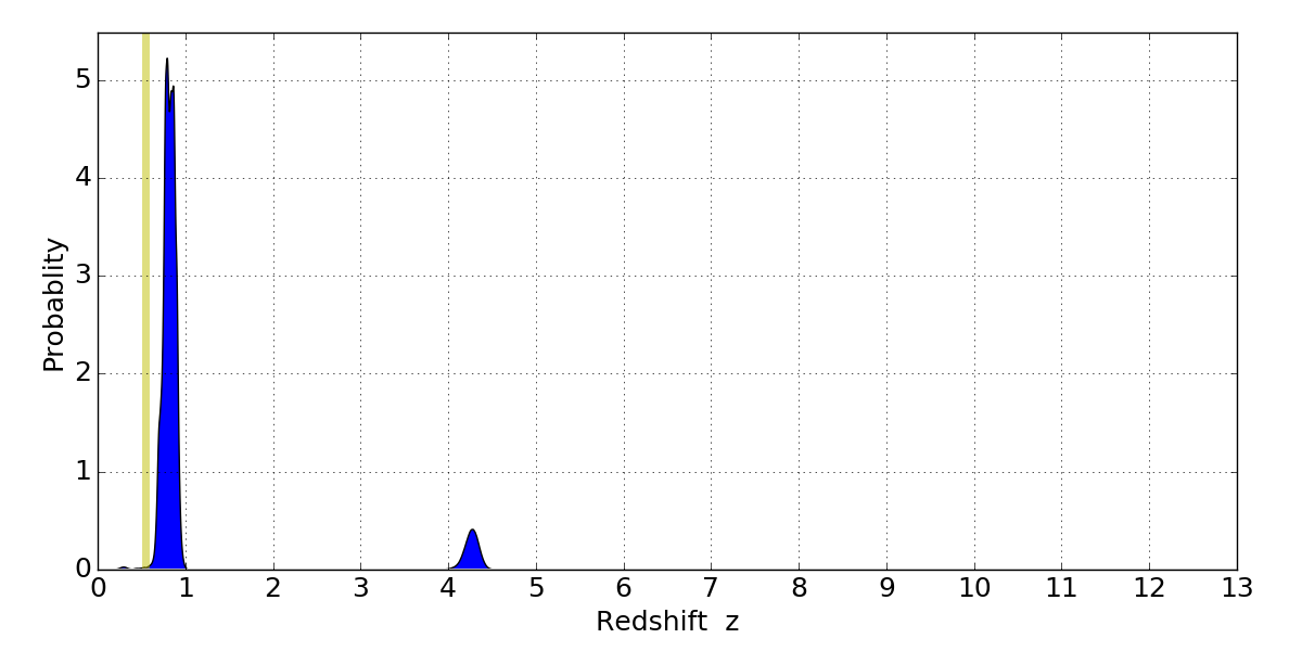In P(z) plots: Yellow lines mark the cluster redshift z = 0.546,