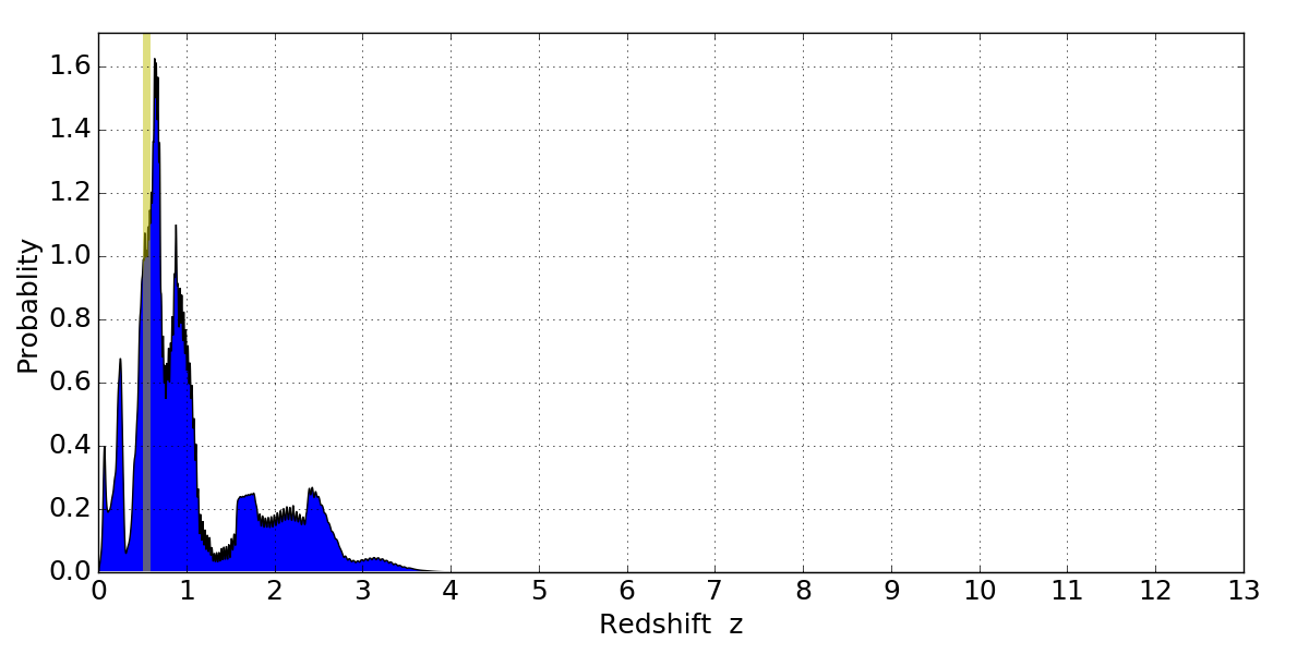 In P(z) plots: Yellow lines mark the cluster redshift z = 0.546,