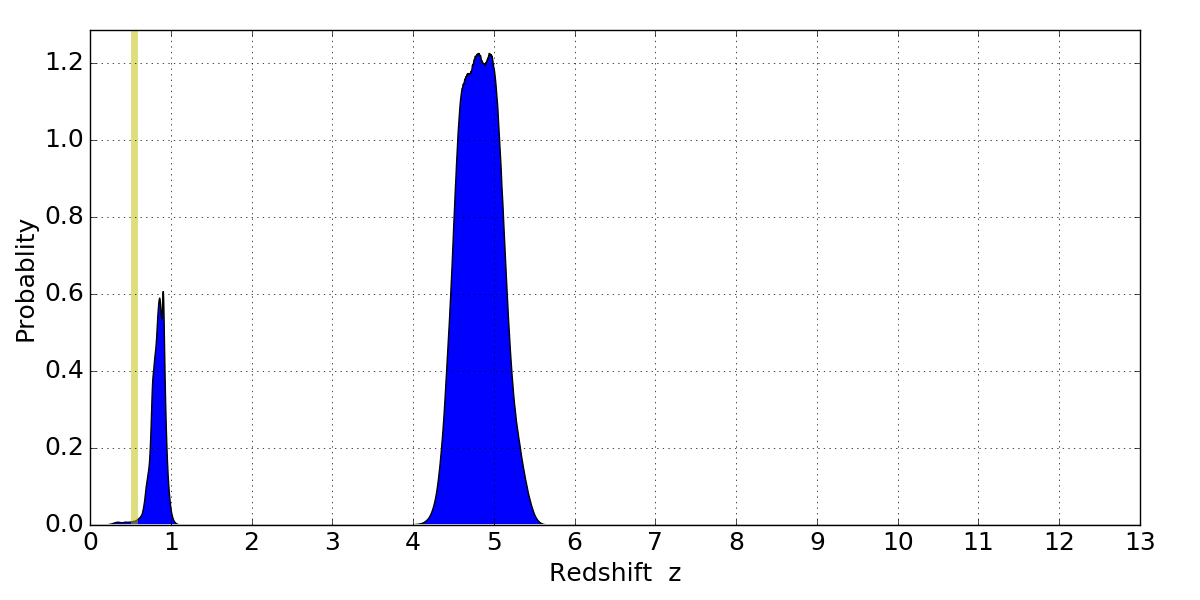 In P(z) plots: Yellow lines mark the cluster redshift z = 0.546,