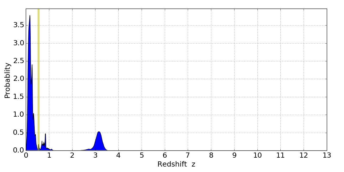 In P(z) plots: Yellow lines mark the cluster redshift z = 0.546,