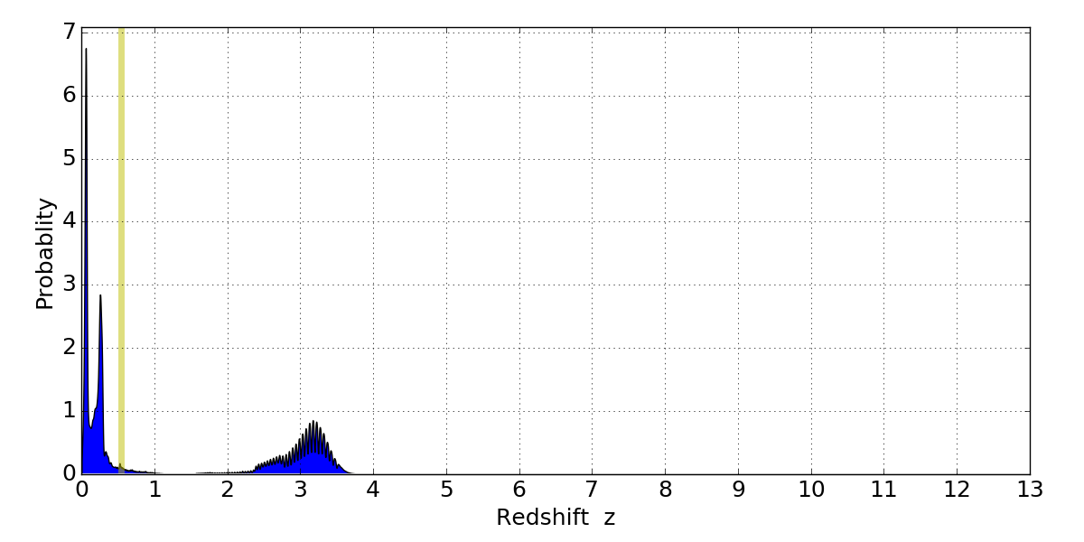 In P(z) plots: Yellow lines mark the cluster redshift z = 0.546,