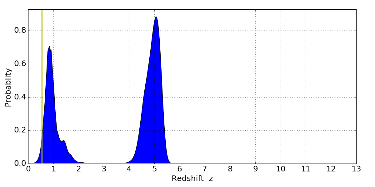 In P(z) plots: Yellow lines mark the cluster redshift z = 0.546,