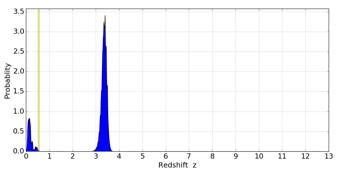 In P(z) plots: Yellow lines mark the cluster redshift z = 0.546,