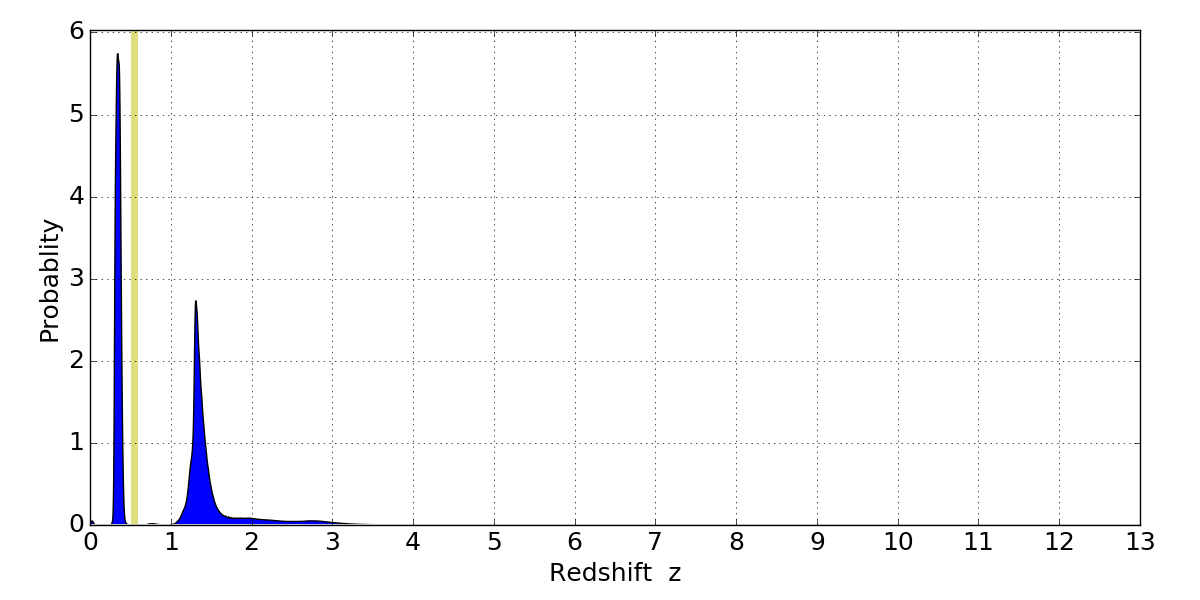 In P(z) plots: Yellow lines mark the cluster redshift z = 0.546,