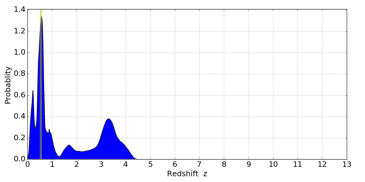 In P(z) plots: Yellow lines mark the cluster redshift z = 0.546,