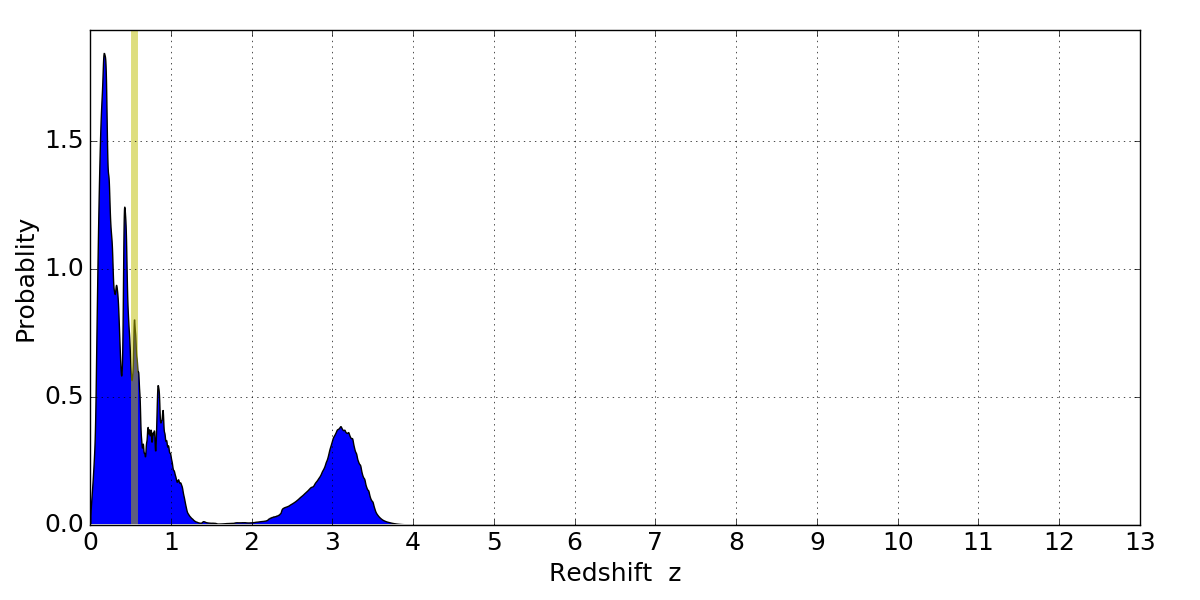 In P(z) plots: Yellow lines mark the cluster redshift z = 0.546,